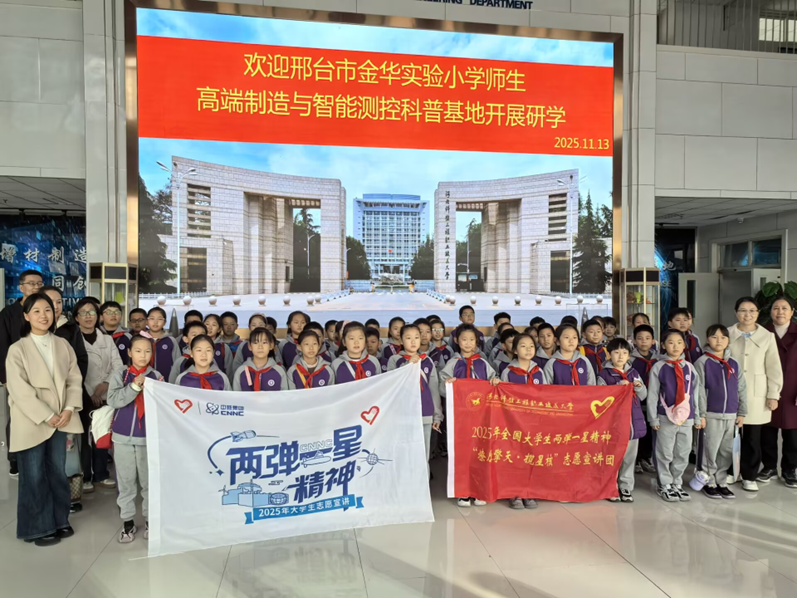 1113日,邢台市金华实验小学50余名师生走进我校河北省高端制造与智能测控科普示范基地,开启了一场别开生面的研学之旅,通过沉浸式科技体验与红色精神宣讲相结合的形式,让孩子们在触摸科技脉搏的同时,筑牢红色信仰,实现科学精神启蒙与红色基因传承的双向赋能。